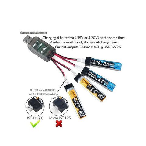Chargeur USB pour batterie LiPo AOkoda CX405 1S 4,2 V 4,35 V LiPo LiHV JST-PH 2.0 mCPX, connecteurs Tiny Whoop (lot de 2)